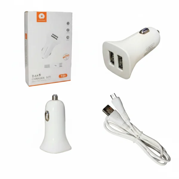 Ensemble chargeur voiture pratique comprenant un adaptateur à double port USB et un câble, conçu pour offrir une charge rapide, stable et sécurisée. Avec une puissance de 2.4A, il permet de recharger simultanément deux appareils tels que smartphones, tablettes ou accessoires. Compact et fiable, il est idéal pour une utilisation quotidienne en voiture.