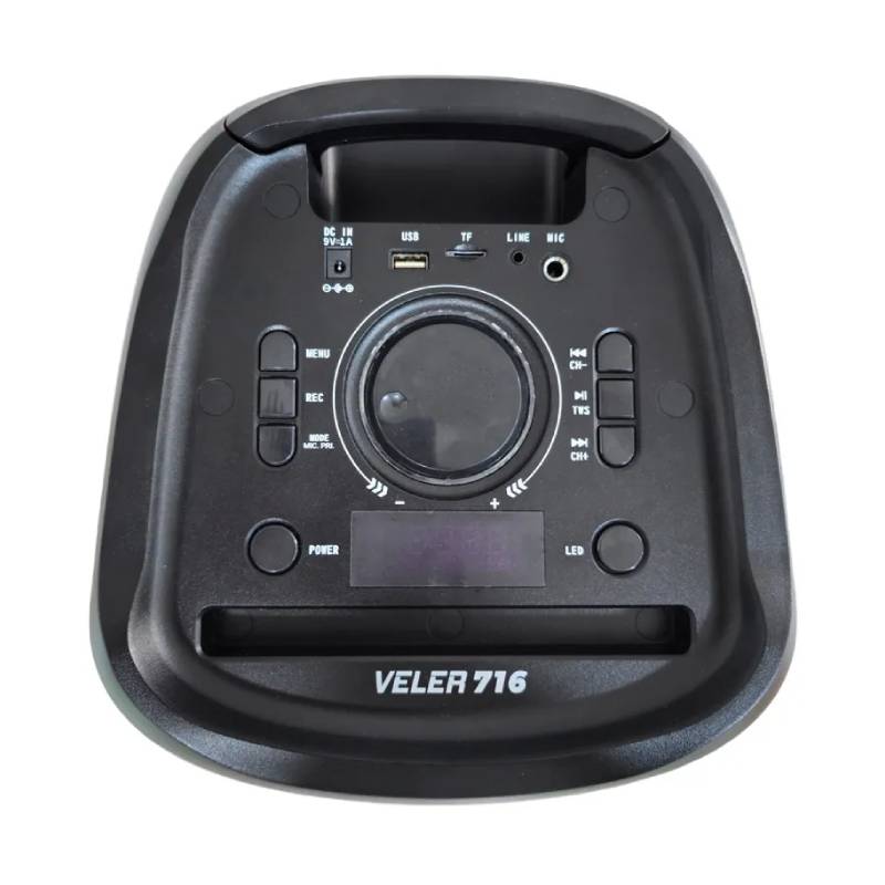 Haut Parleur Bluetooth Veler V-716 – Puissance: 400 Watts – Connectivité: Sans Fil (Bluetooth) – Avec Microphone sans fil – Autonomie: Jusqu’à 4 heures – Temps de charge: entre 3 et 4 heures de recharge – Batterie: 2400 mAh Lithium – Poids: 6.4 kg – Dimensions: 290 x 271 x 580 mm – Couleur: Noir