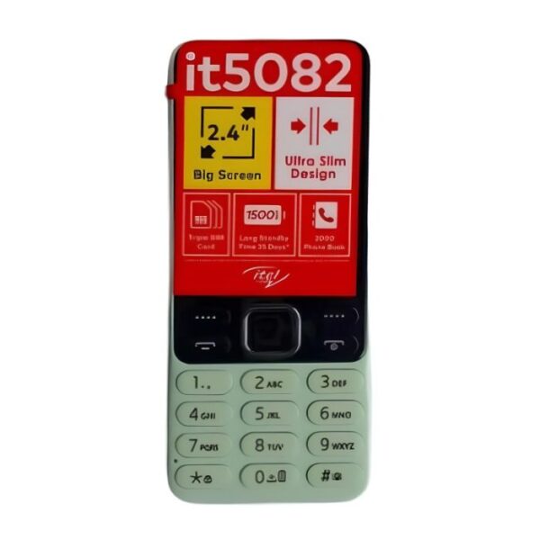 Écran: 2.4″ TFT clair et lisible – Résolution: 240 x 320 pixels – Navigateur Internet Opera Mini préinstallé – Mémoire de 2000 contacts et 200 messages – Capacité batterie: 1200 mAh – Appareil Photo: 1,3 Mpx avec flash – Lampe torche – Autonomie en veille: Jusqu’à 35 jours – Radio FM sans fil – Connecteurs: Port USB, prise pour écouteurs – Triple SIM – Design robuste et ergonomique – Couleur: Vert Clair – Garantie: 1 an